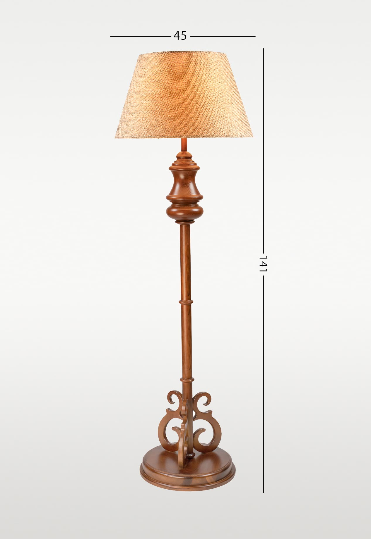 The wooden floor lamp model 614 is a tribute to timeless craftsmanship and vintage elegance. Its sculpted wooden stem features ornate turned detailing that gracefully transitions into a rounded base adorned with traditional scroll-shaped supports.