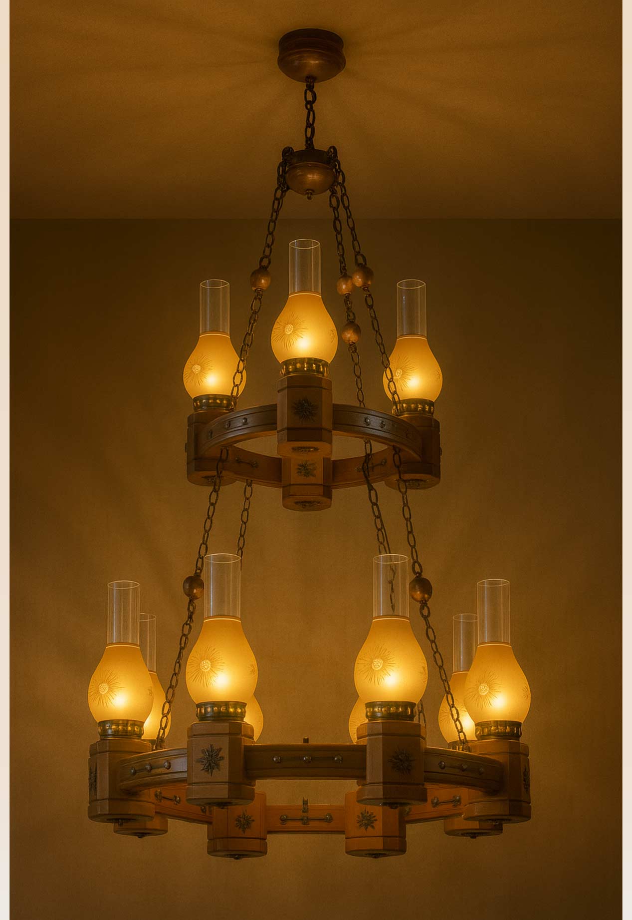 The Wooden Chandelier – 206-12 is a grand double-tier centerpiece designed to command attention with its architectural presence and heritage-inspired detailing. Featuring twelve lantern-style frosted glass shades etched with radiant sunburst motifs, this chandelier casts a warm, inviting glow that enhances both traditional and luxury spaces.