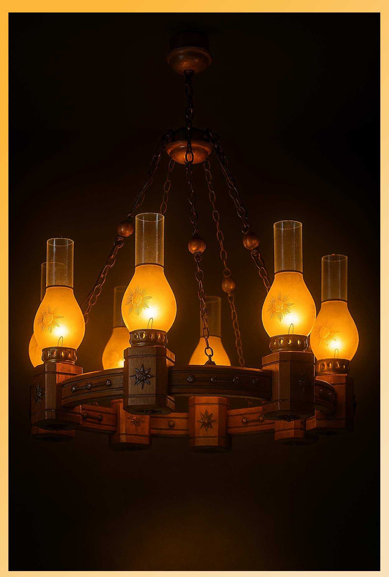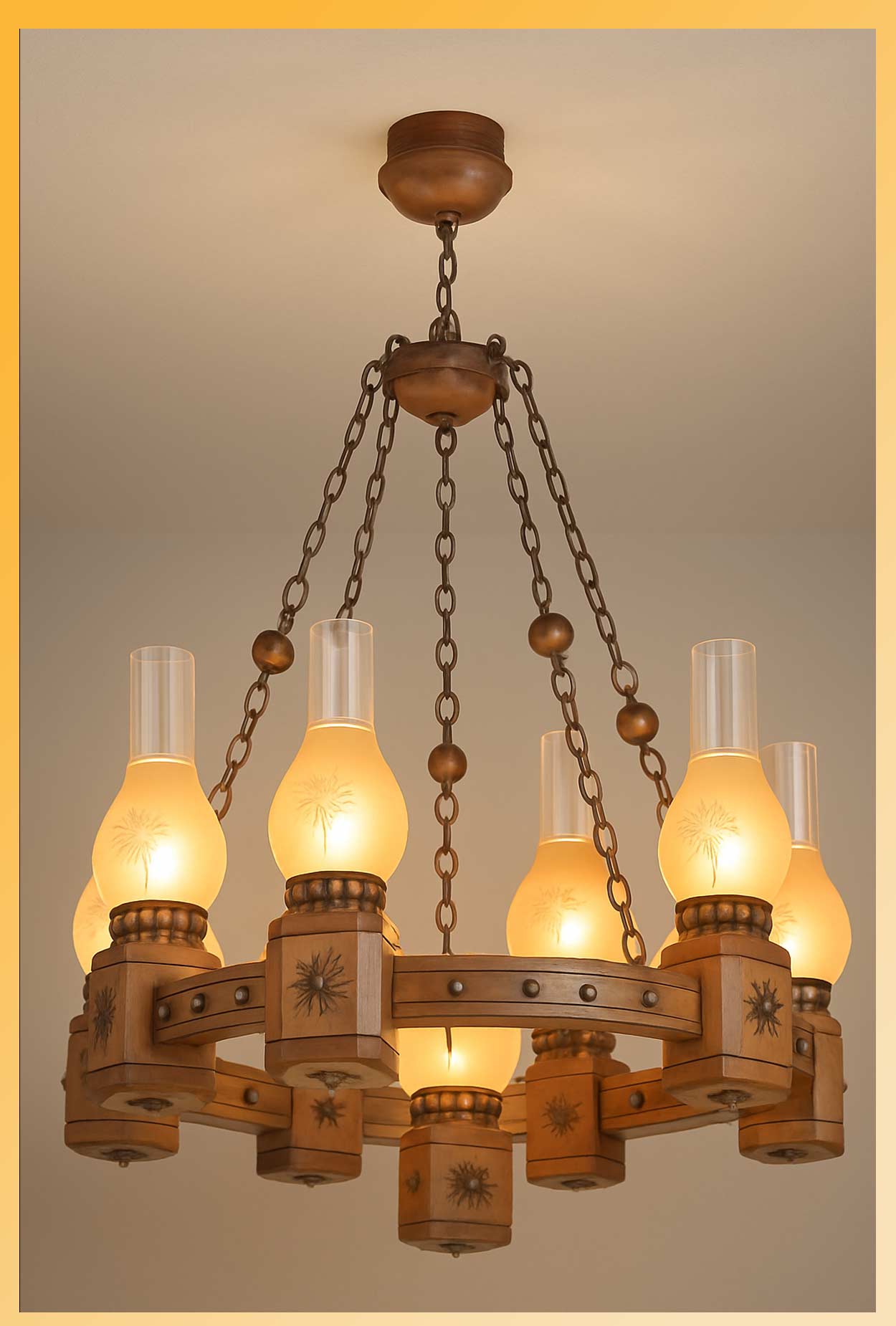 The Wooden Chandelier – 206-8 is a magnificent statement piece designed to bring grandeur, warmth, and timeless elegance into large interior spaces. With eight lantern-style frosted glass shades engraved with delicate sunburst motifs, this chandelier casts a rich ambient glow, creating a majestic yet inviting atmosphere.