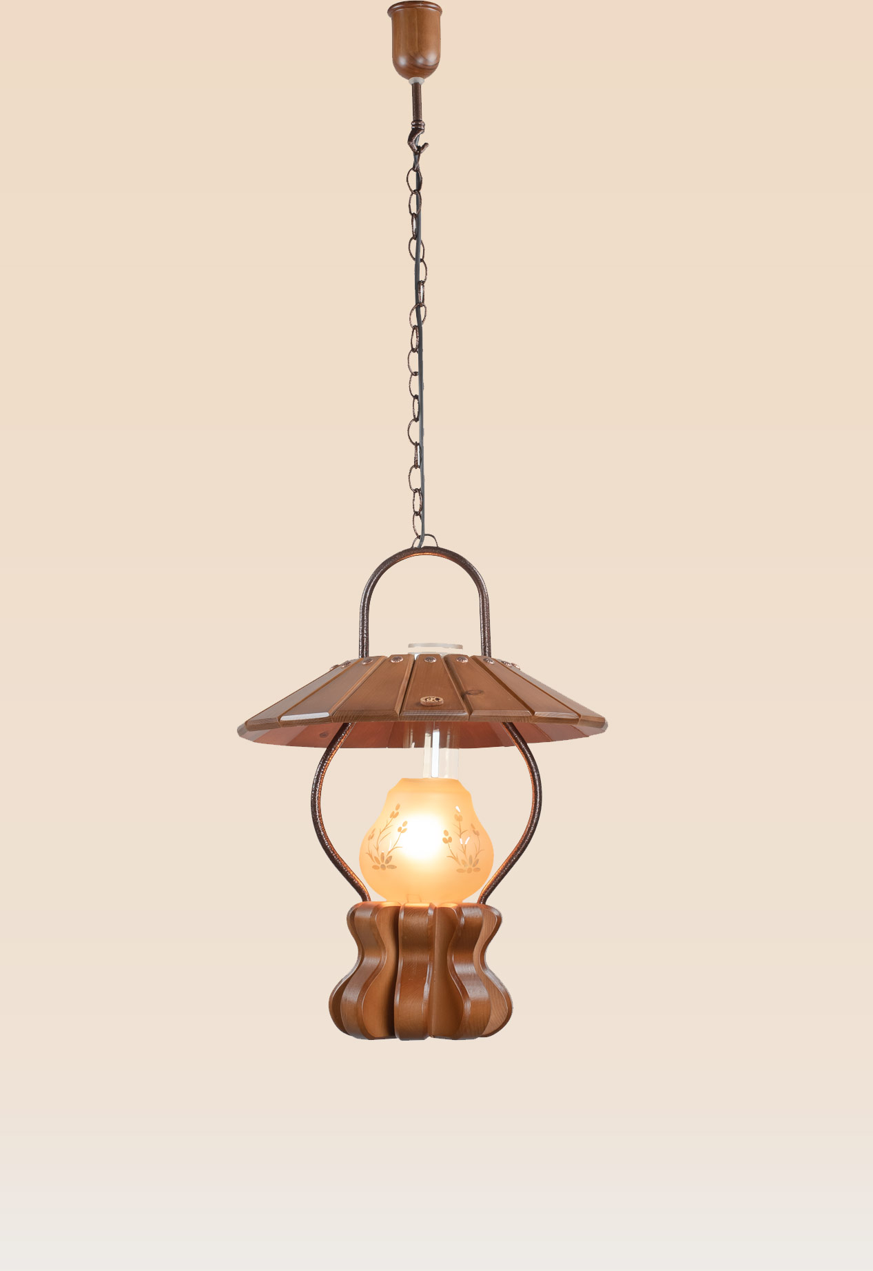 Pendant light model 48 resembles a rustic lantern, with a frosted floral glass shade suspended within sculpted wood and wrought metal curves. A nostalgic blend of countryside elegance and handmade warmth.