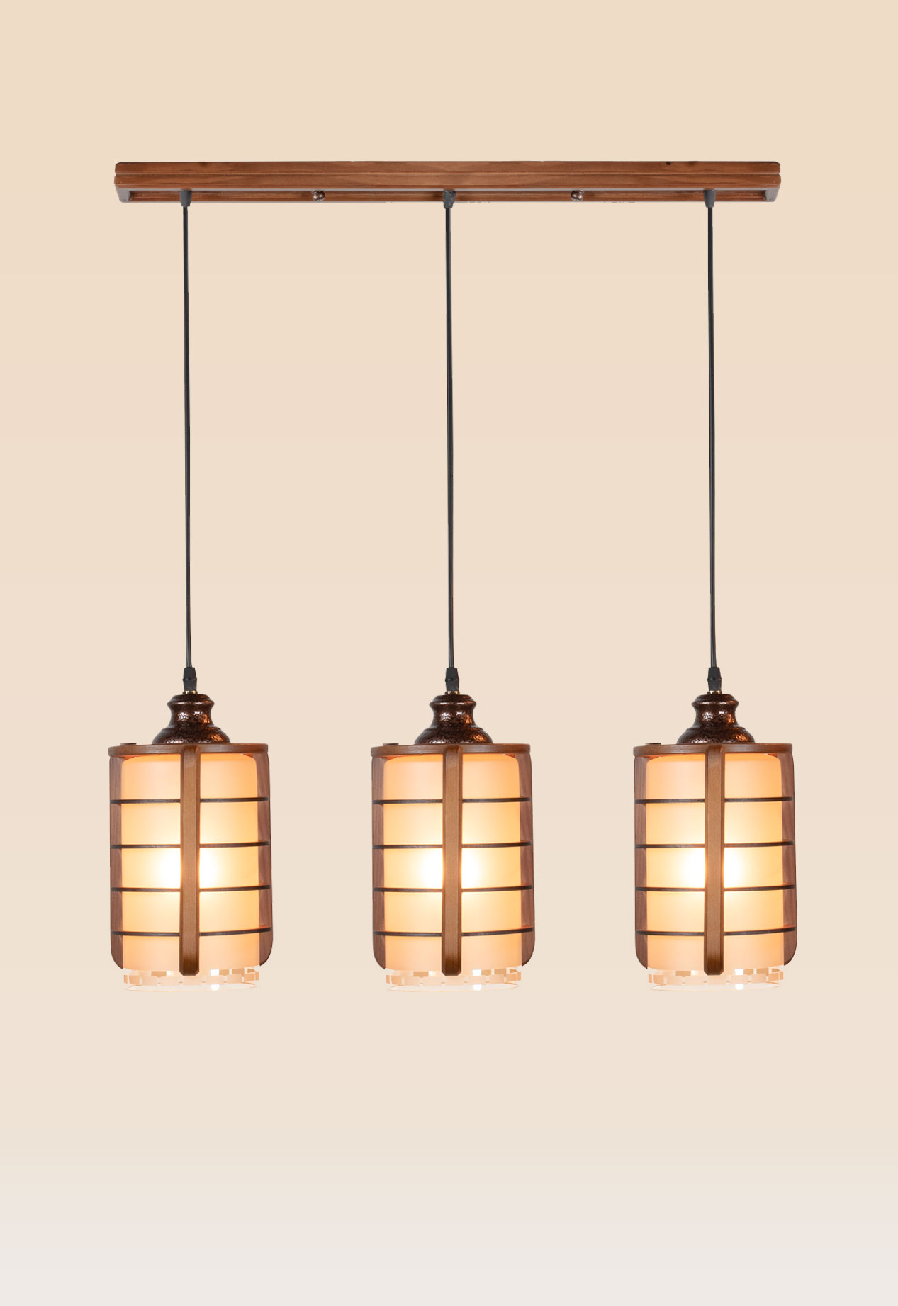 Each pendant is adorned with a wooden grid frame over a frosted glass cylinder, softly diffusing the light to produce a cozy ambiance. The horizontal layout makes it ideal for extended surfaces like dining tables, bar counters, and kitchen islands, providing even illumination with artisanal elegance.