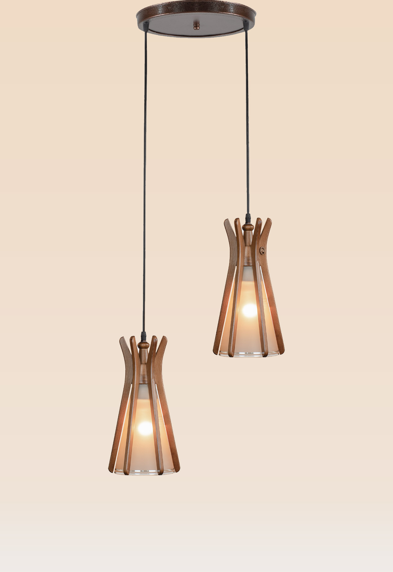 Pendant light code 41-2 brings double the charm with its twin wooden shades, each shaped like a blooming hourglass — softly curving around frosted inner glass tubes that emit a gentle ambient glow.