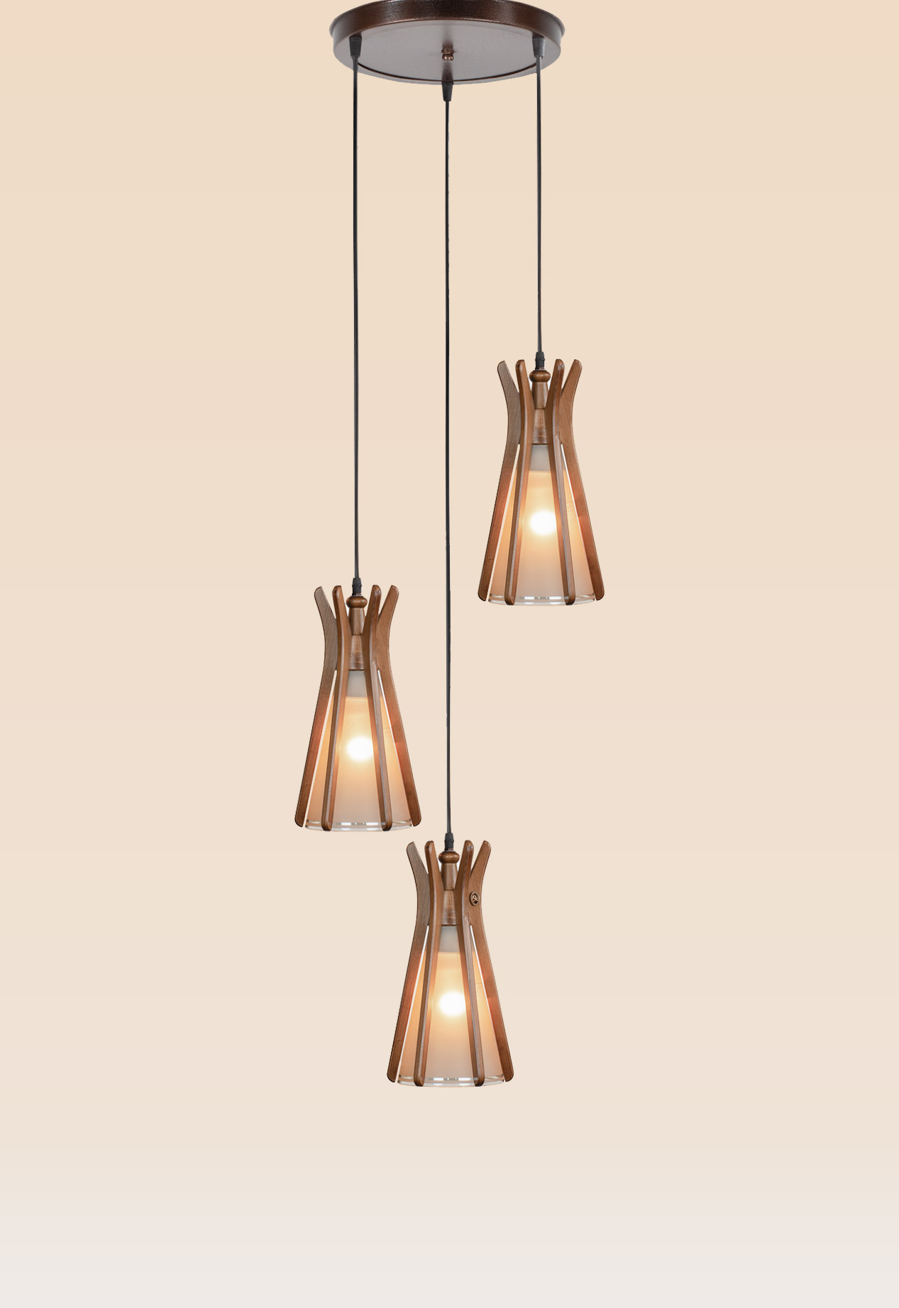 A trio of elegant wooden pendant lights suspended at varying heights from a circular canopy. The frosted inner glass and sculpted wood create a modern statement with warmth and rhythm.