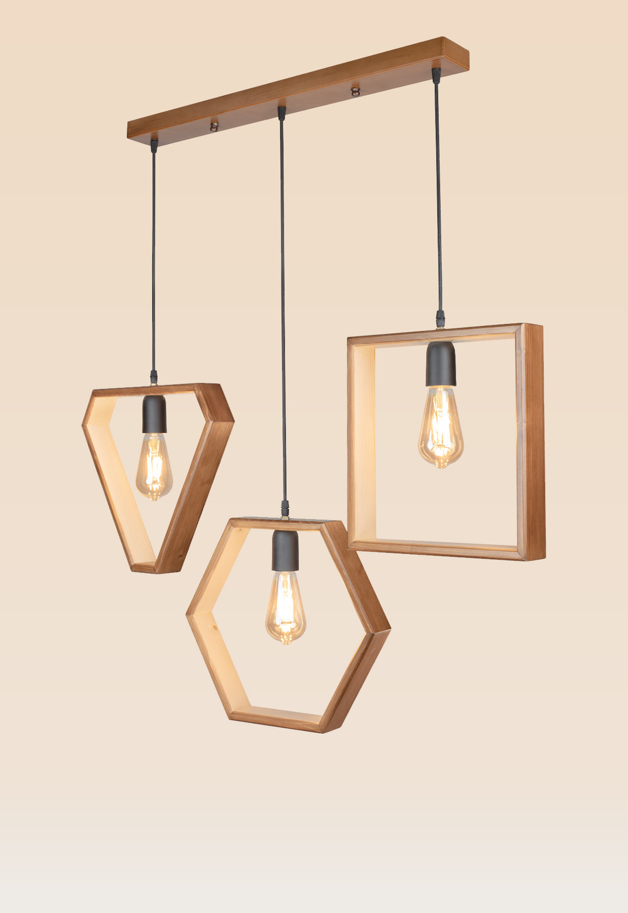 Pendant light model 44 is a celebration of geometry and natural material, suspended in harmony. Featuring three uniquely shaped wooden frames — a diamond, a hexagon, and a square — this pendant light turns simple forms into sculptural elegance. Each frame cradles a warm glowing filament bulb, casting soft shadows and highlighting the crisp lines of its design.