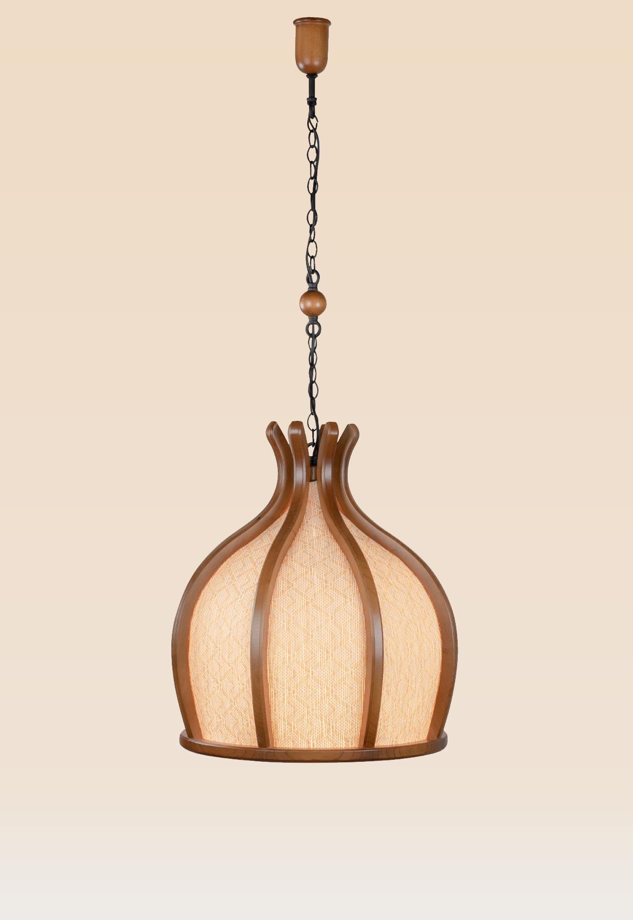 Model 54-3 features a dome-shaped pendant framed in curved wooden ribs and wrapped in patterned woven fabric. Its sculpted top and chain suspension offer a rustic yet refined silhouette, glowing with natural charm and warm ambience.