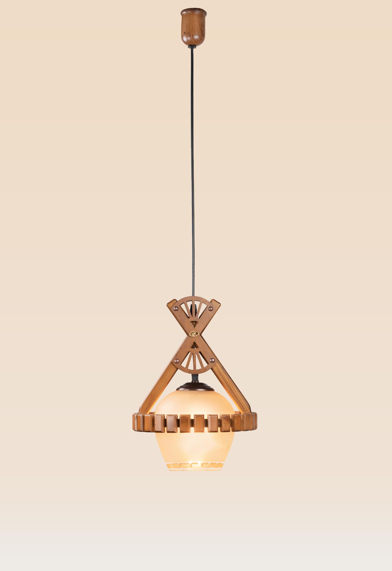 The contrasting elements of rigid lines and soft curves give this fixture both architectural presence and inviting charm. The etched frosted glass softly diffuses the light while the detailed wooden structure draws the eye upward, creating a suspended sculpture of light and material.