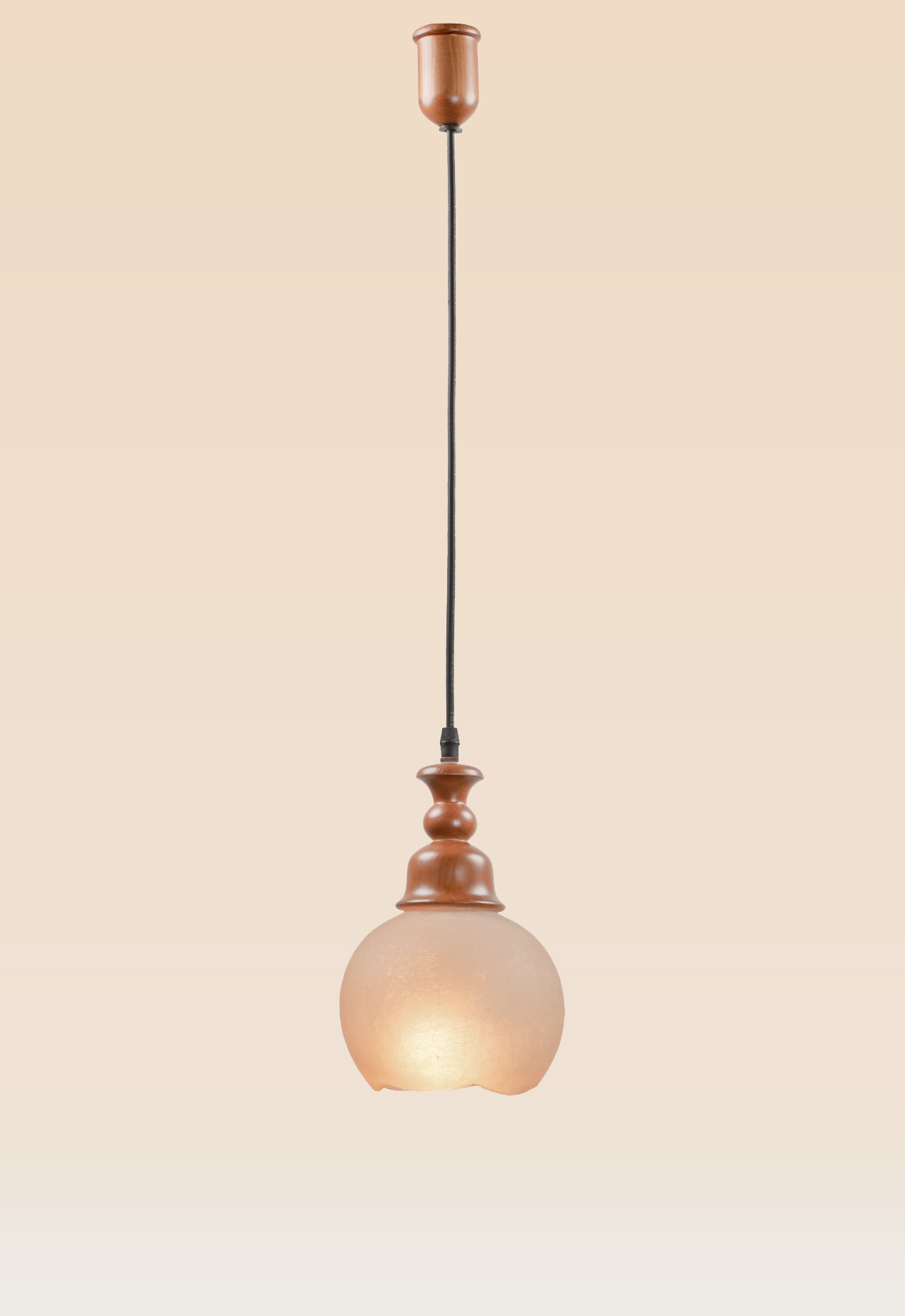 Model 60 is a compact pendant light featuring a sculpted wooden crown and a softly textured glass globe. With its warm materials and elegant simplicity, it brings vintage soul and gentle light to cozy, character-filled interiors.