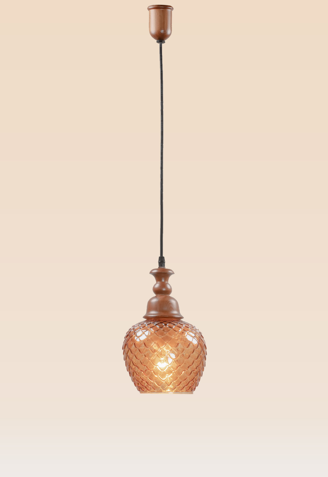 Model 61 is a single pendant light featuring a carved wooden crown and a textured amber glass shade with a pinecone-inspired pattern. Its warm, decorative glow and artisan detail bring rustic elegance to any space.