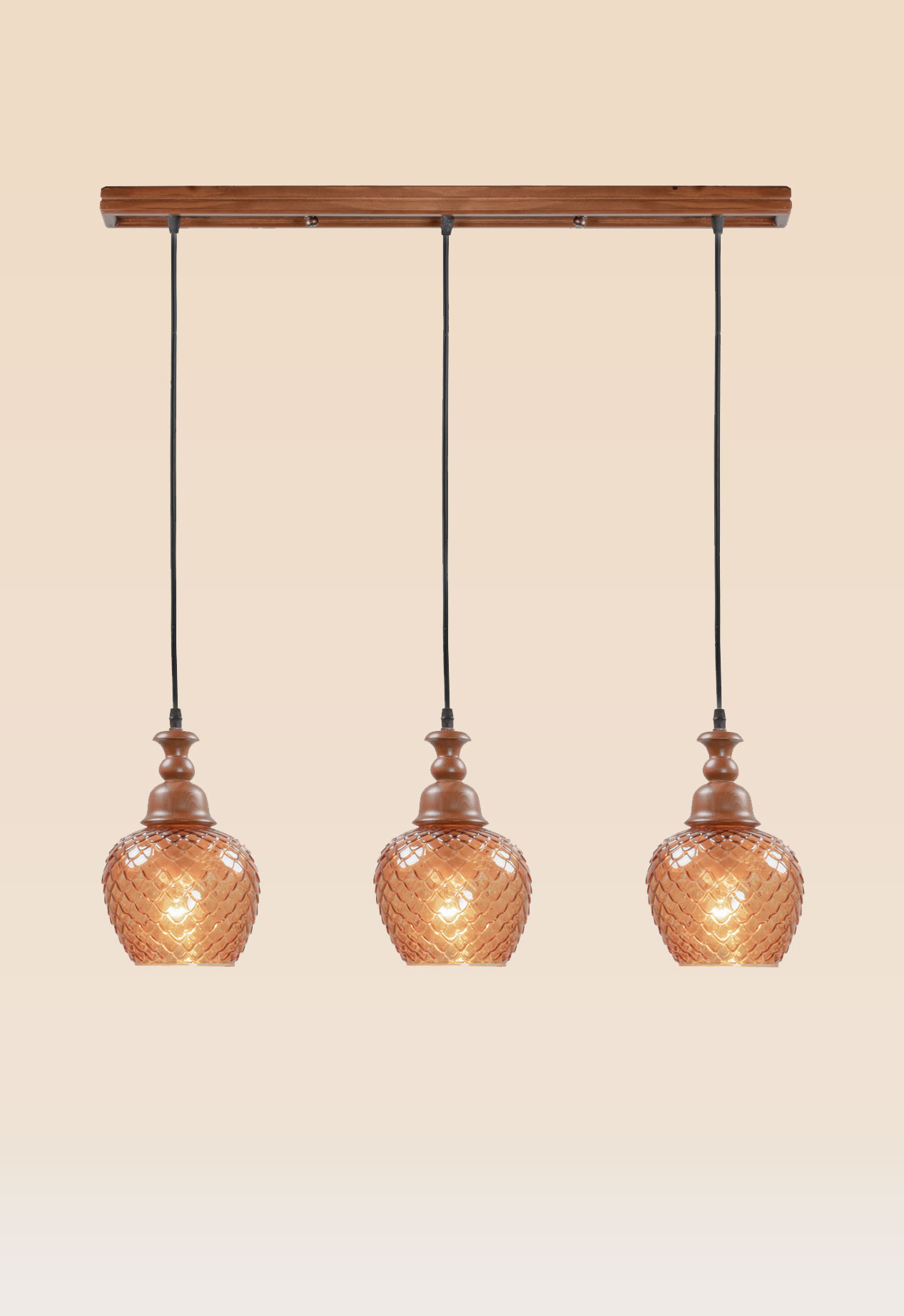 Model 61h3 is a horizontal triple pendant light featuring hand-turned wooden tops and amber-patterned glass globes. Suspended in perfect symmetry from a linear wooden canopy, it brings glowing texture and rustic elegance to any setting.