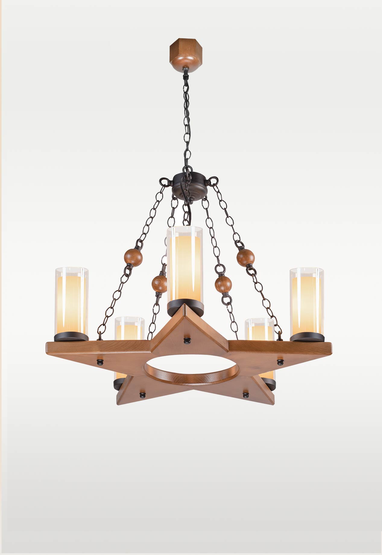The Wooden Chandelier – 228-5 is a remarkable fusion of geometry and rustic charm, designed to captivate with its bold star-shaped base. Each of its five arms supports a dual-layer cylindrical glass shade — frosted inside for soft diffusion and clear outside for polished elegance.
