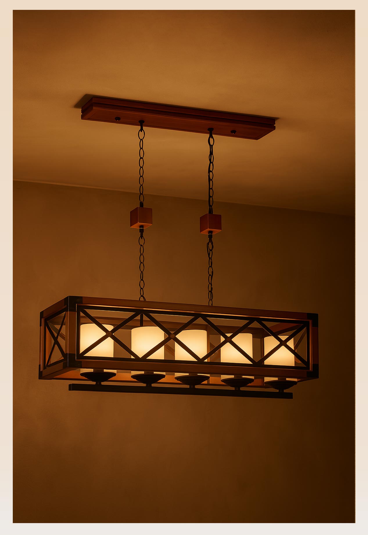 The Wooden Chandelier 207-5 is a bold statement piece that merges structural elegance with warm rustic character. Its rectangular frame, crafted from solid wood with precision machine cutting, is enhanced by matte black crisscross metal detailing and reinforced corners — creating both strength and visual rhythm. Suspended by dual black chains with wooden cube accents, it delivers balanced sophistication ideal for linear spaces.