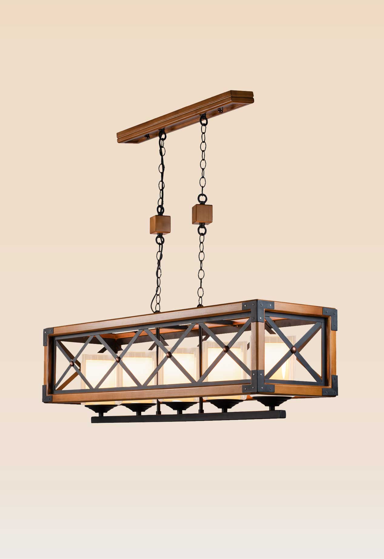 A striking rectangular wooden chandelier with five frosted glass lights framed by rustic crisscross metal accents, blending modern industrial elegance with traditional wooden charm. Designed and finished by DARKAR Lighting Industries, distributed by Checkmark.