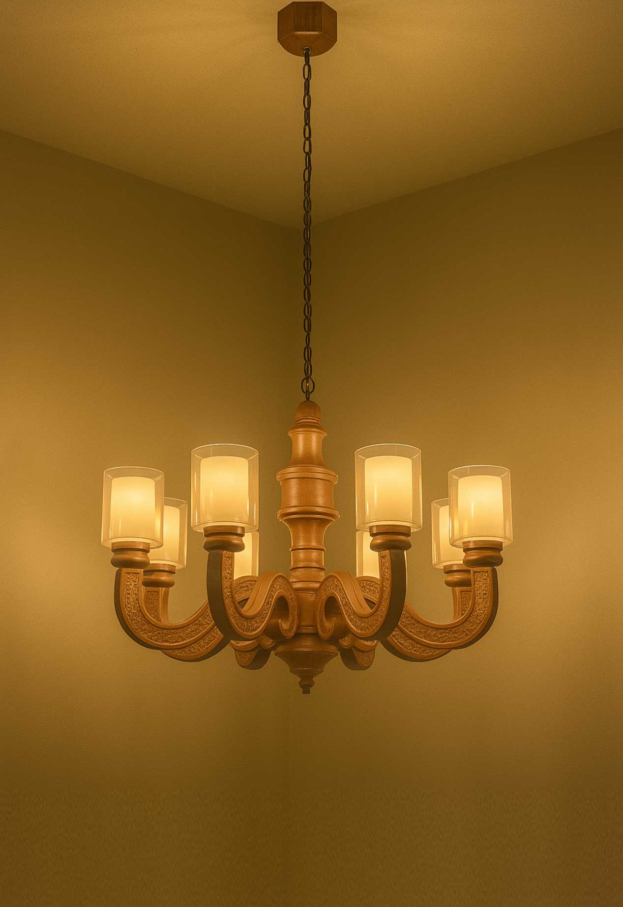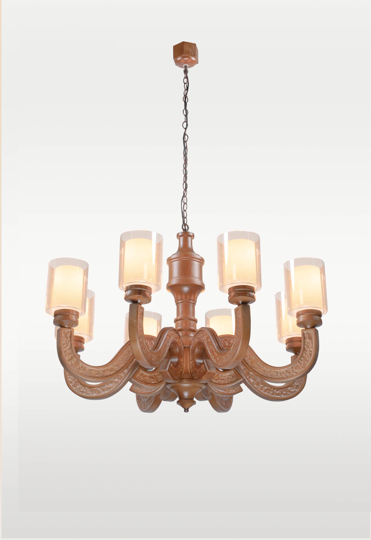 The Wooden Chandelier – 227-8 is a stunning statement of classic grandeur, designed to elevate spacious interiors with elegance and warmth. Featuring eight gracefully curved wooden arms, richly engraved with scroll patterns, each supporting a cylindrical glass shade with a frosted inner layer and a clear outer cover. This layered glass design diffuses light softly while preserving a polished, sophisticated look.