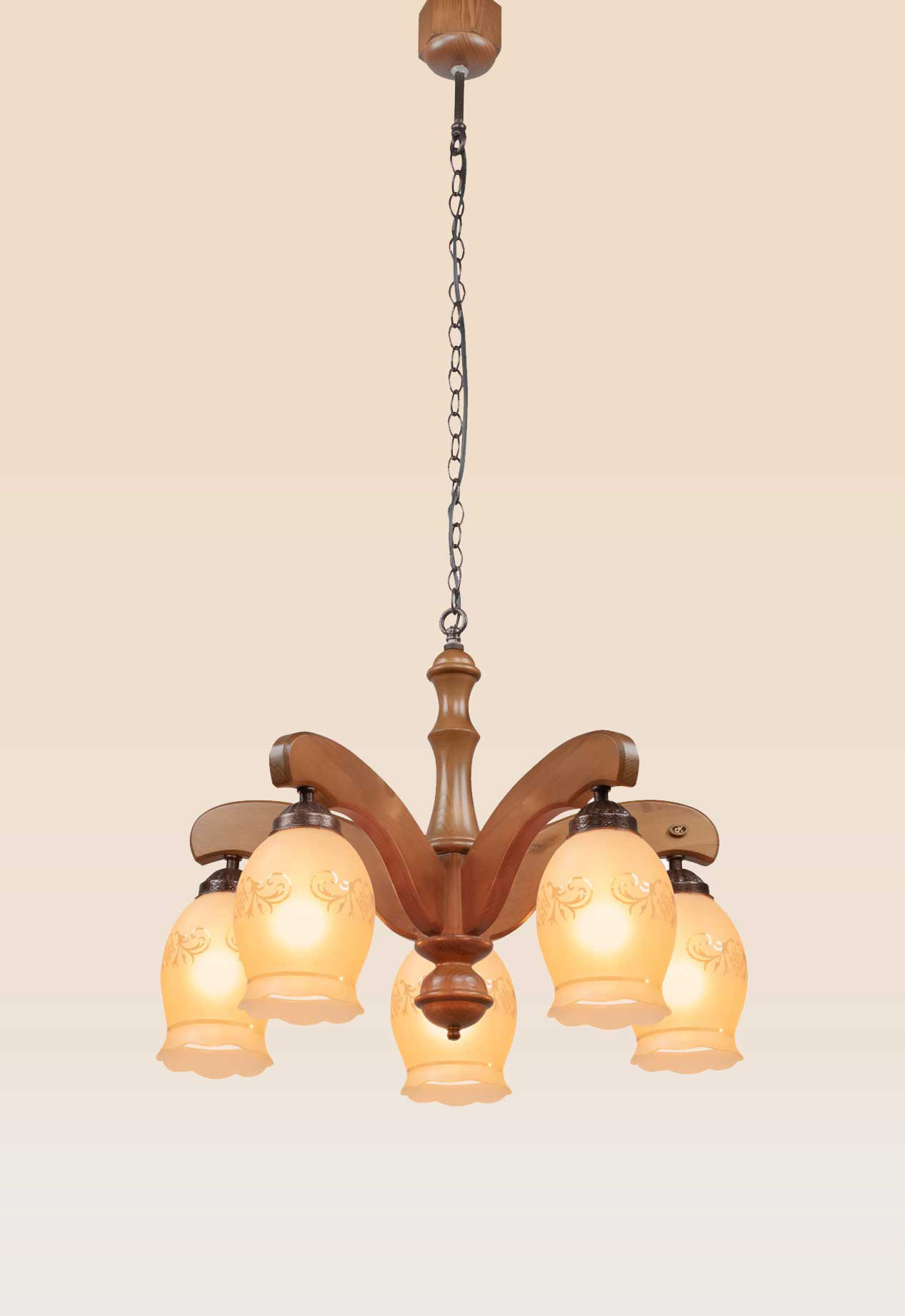 The Wooden Chandelier 208-5 embodies timeless elegance, combining natural wooden structure with decorative artistry. Its central wooden column extends into five gracefully arched arms, each supporting a frosted glass shade beautifully etched with floral detailing. The result is a chandelier that radiates both warmth and sophistication.