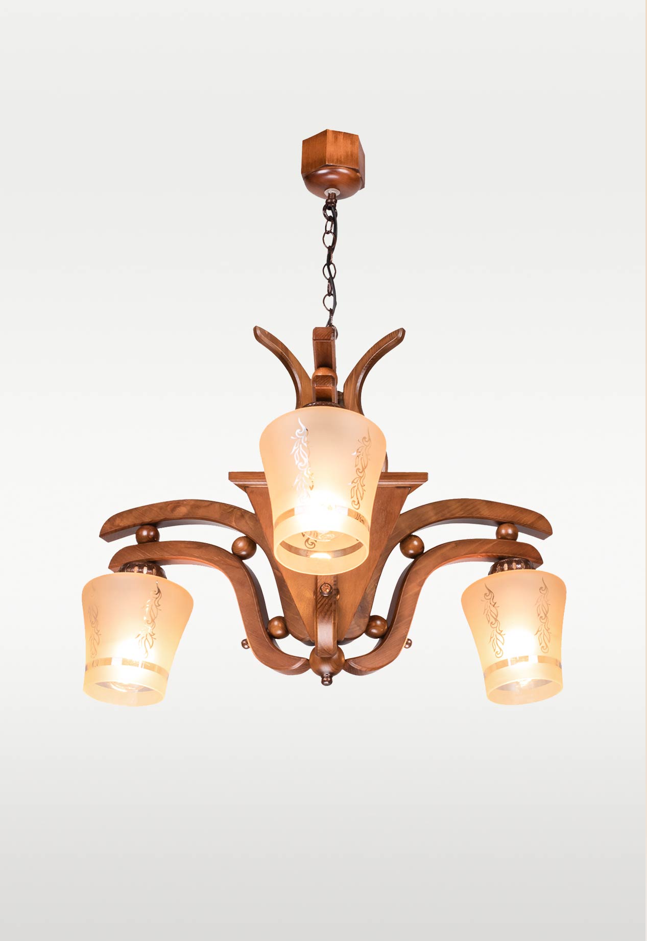 The Wooden Chandelier 210-3 combines natural wood elegance with three frosted glass shades etched in floral patterns. Its curved arms and smooth detailing create a warm, decorative centerpiece for intimate interiors. Distributed in the UAE by Checkmark, manufactured by DARKAR Lighting Industries.