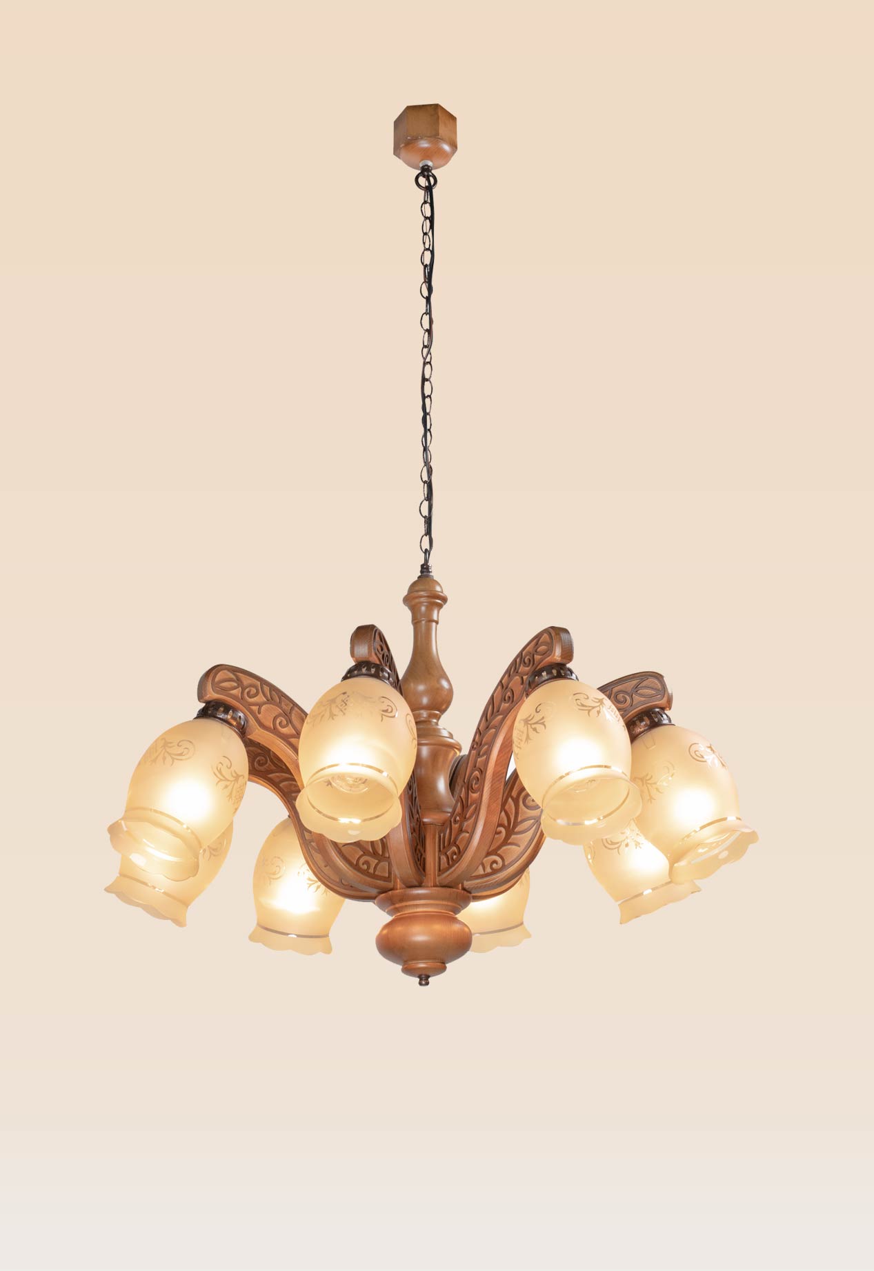 The Wooden Chandelier 234-8 is a graceful fusion of artistry and functionality, designed to bring heritage-inspired elegance to classic interiors. With eight intricately carved wooden arms extending from a central column, this chandelier radiates a sense of balance and sophistication. Each arm is adorned with delicate scrollwork and fitted with frosted bell-shaped glass shades etched with floral motifs, casting a soft, ambient glow.