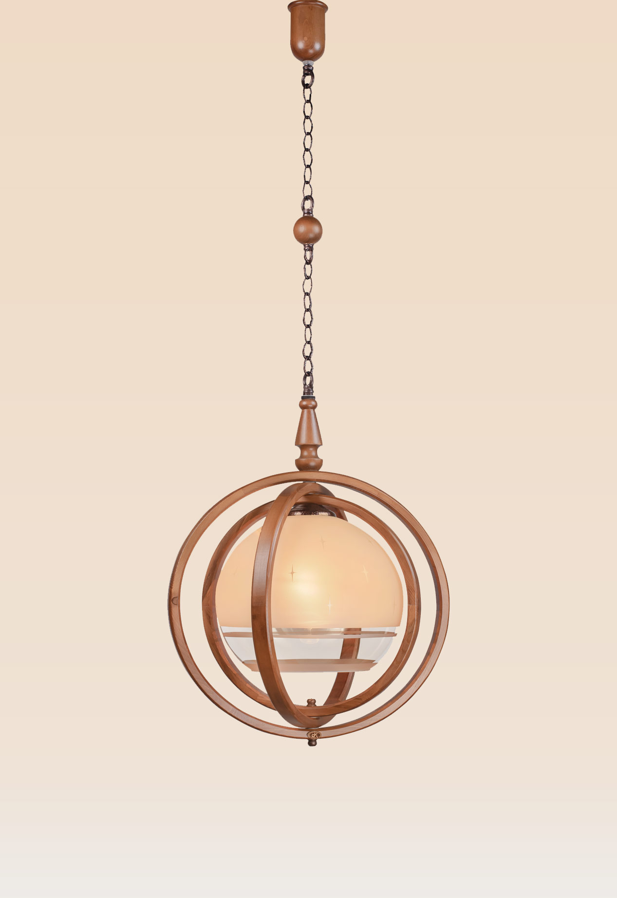Crafted by DARKAR Lighting Industries, suspended from a chain with wooden and metal detailing, Model 23 offers both functional lighting and visual impact. The frosted glass emits soft, diffused light, while the clear lower band adds a subtle accent. This makes it ideal for double-height foyers, staircases, living rooms, and lounge areas where a sculptural pendant can serve as a focal point.