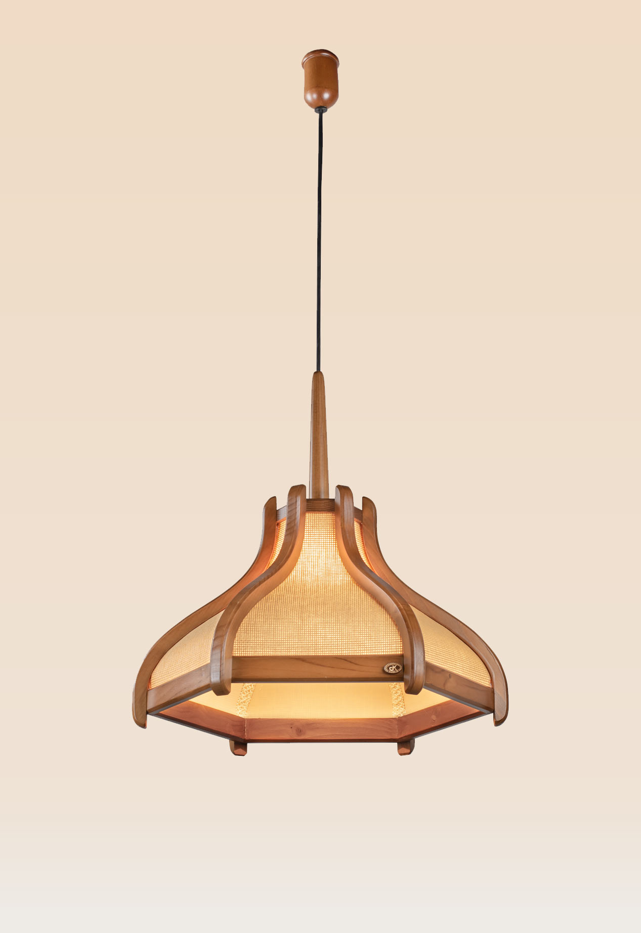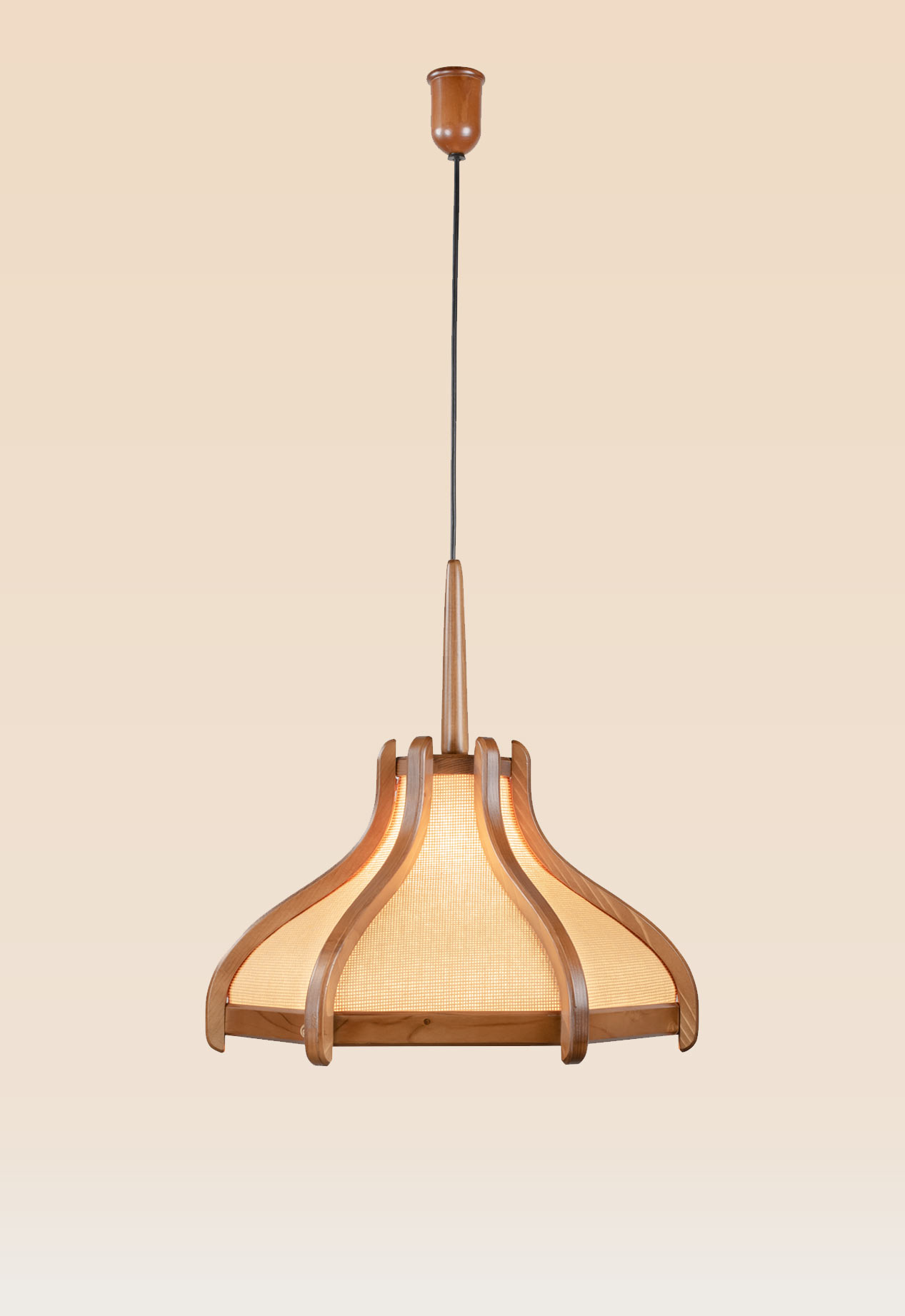 The Wooden Pendant Light – Model 54 features a sculptural silhouette that blends curved wooden ribs with soft fabric shade panels. Rising from a tapered wooden neck, its flared form opens into graceful arcs, creating an organic, flowing presence that adds visual warmth and balance to interior spaces.