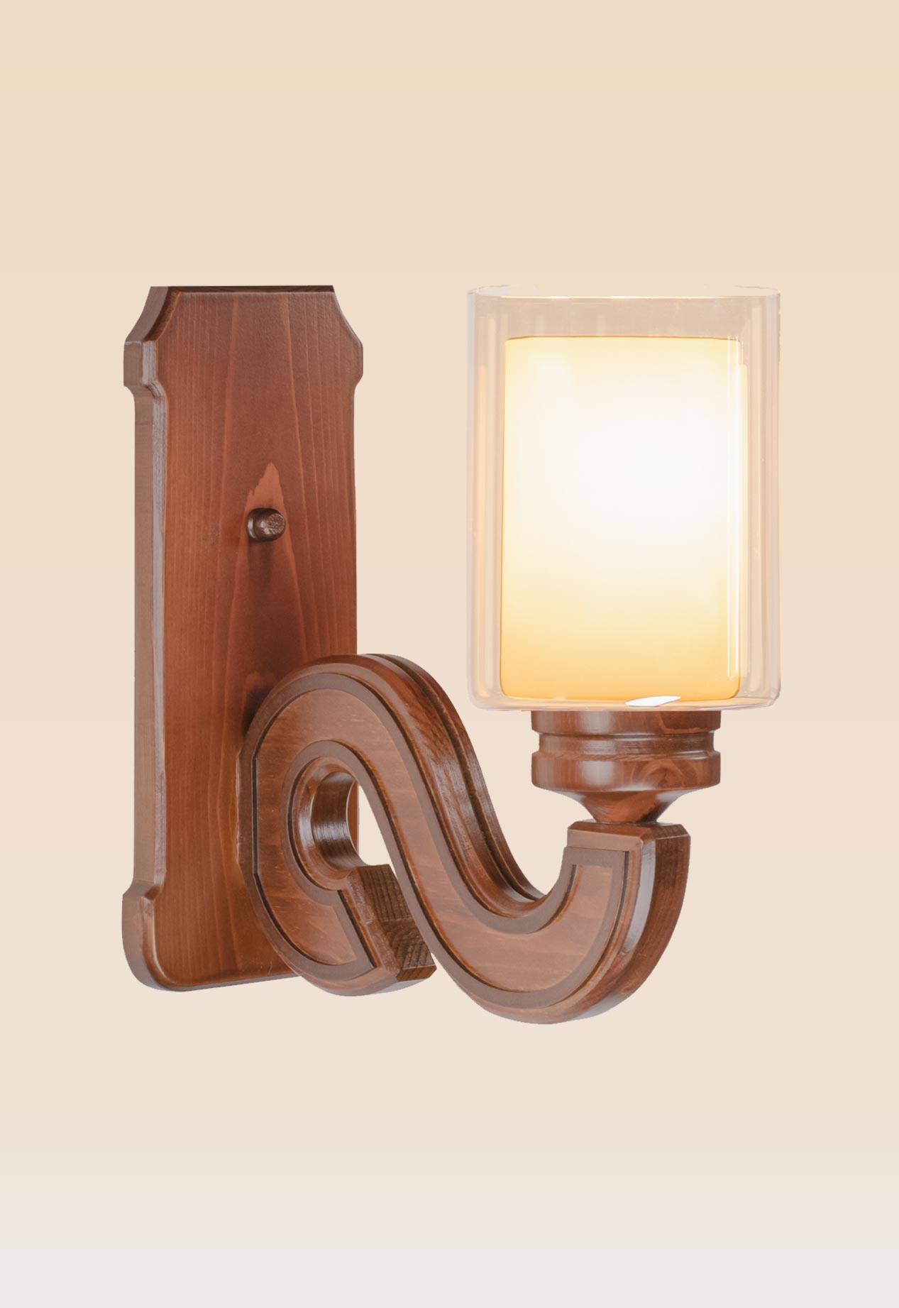 The Wall Sconce Light Model 434 brings together modern wall sconce elegance and rustic charm with expert craftsmanship. Its gracefully curved wooden arm forms a refined S-curve, supporting a clear glass cylinder shade that softly diffuses light. The combination of wooden wall sconce detail with minimalist glass design makes it a versatile fixture for both rustic wall sconces and contemporary interiors.