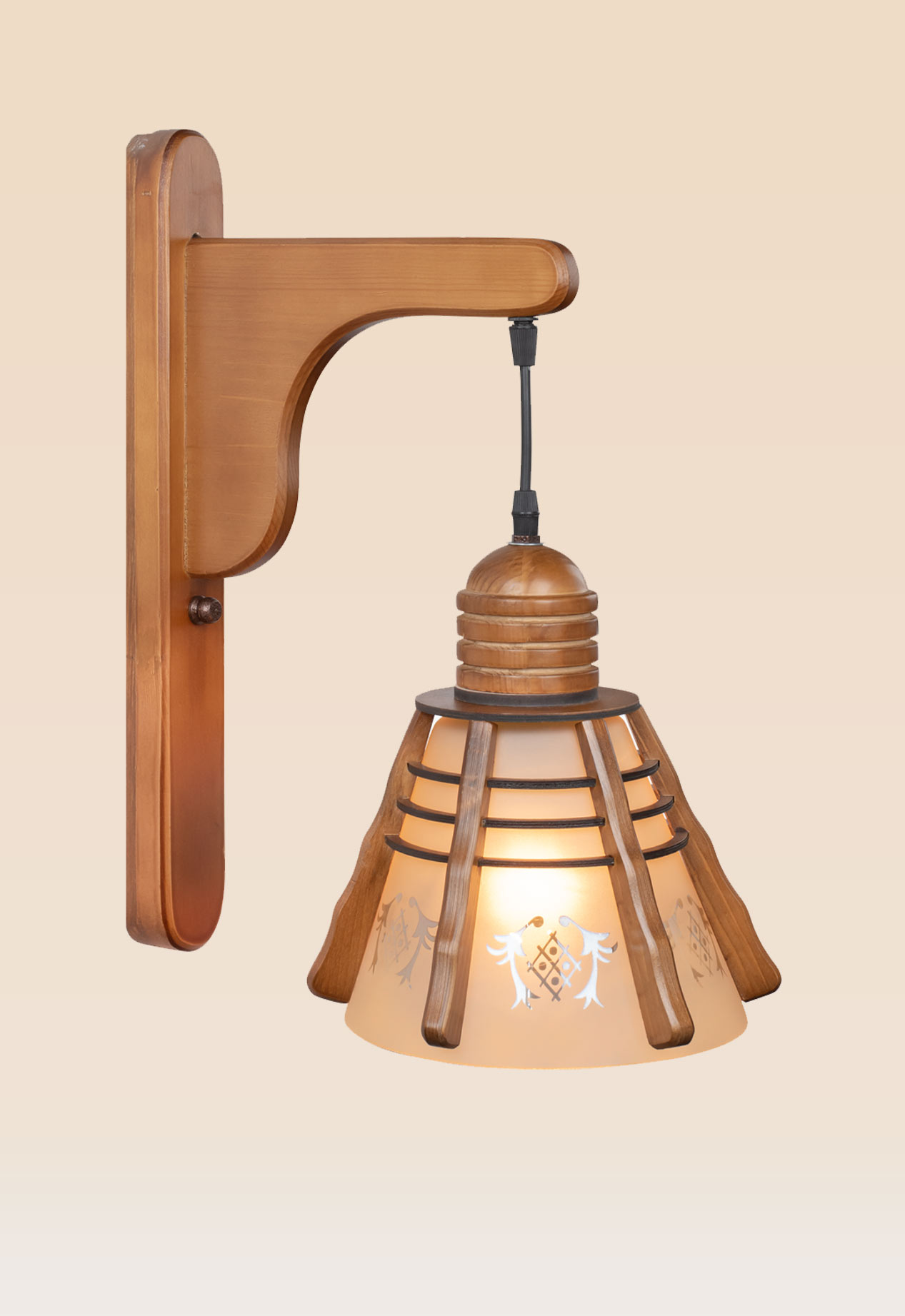 The Wall Sconce Light Model 483 is a striking example of traditional craftsmanship fused with rustic elegance. A sturdy wooden wall bracket supports a suspended fixture topped with a rounded, ribbed wooden cap. The flared frosted glass shade, adorned with delicate etched motifs, is encased in a layered wooden frame that adds both depth and structural beauty.